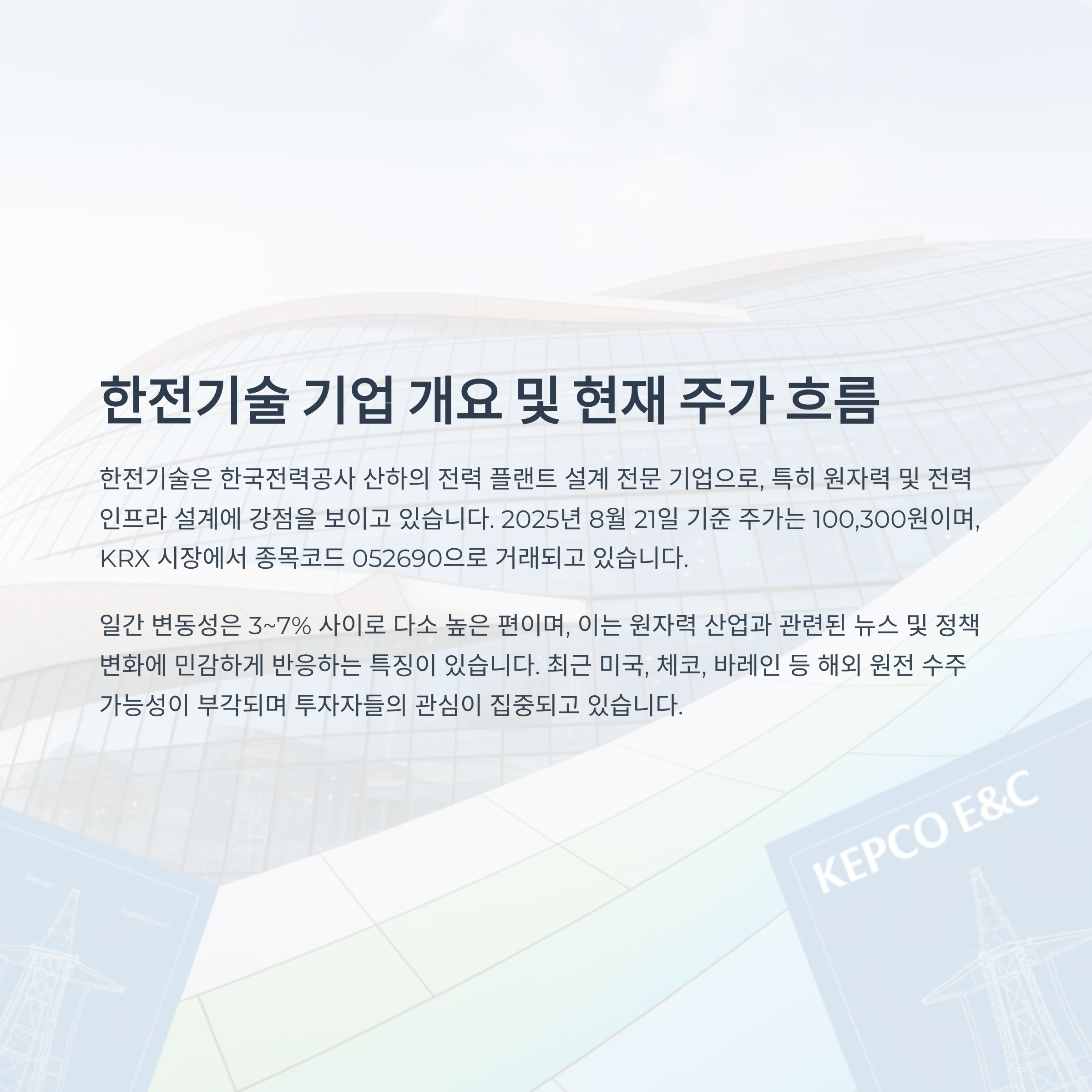 2025년 8월 21일 기준으로 주가는 100,300원이며, KRX 시장에서 종목코드 052690으로 거래되고 있습니다. 일간 변동성은 3~7% 사이로 다소 높은 편이며, 이는 원자력 산업과 관련된 뉴스 플로우 및 정책 변화에 민감하게 반응하는 특징이 있습니다.