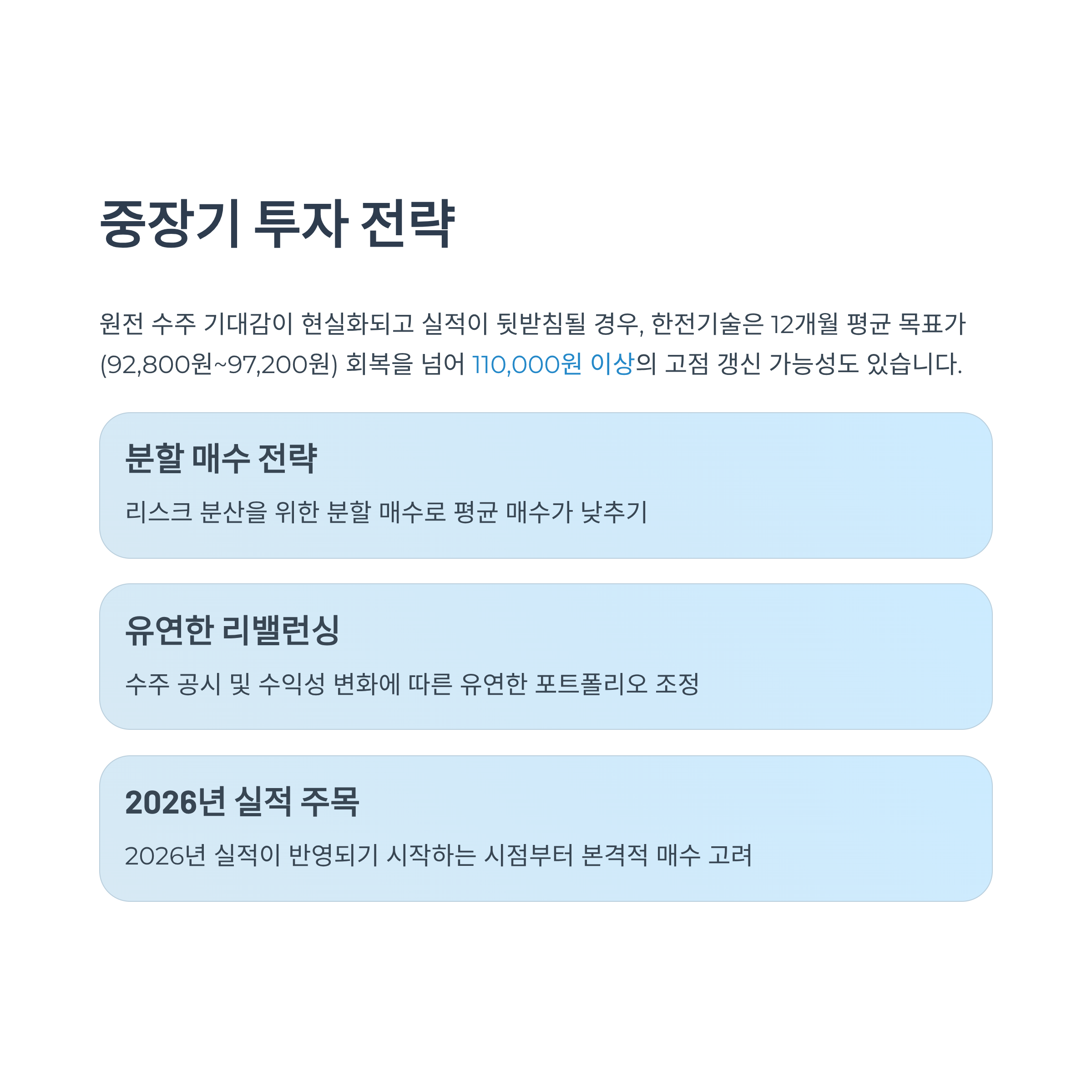 원전 수주 기대감이 현실화되고 실적이 뒷받침될 경우, 한전기술은 12개월 평균 목표가(92,800원~97,200원) 회복을 넘어 110,000원 이상의 고점 갱신 가능성도 있습니다.