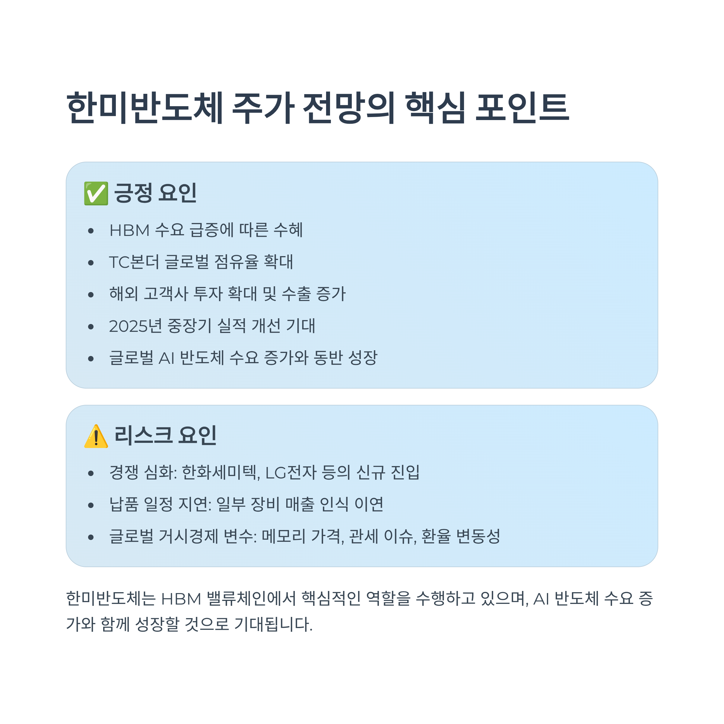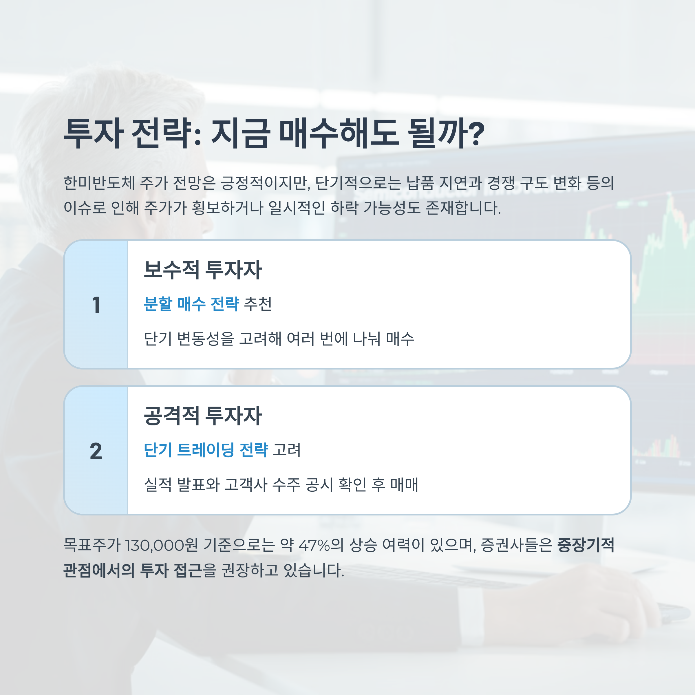 한미반도체 주가 전망은 긍정적이지만, 단기적으로는 납품 지연과 경쟁 구도 변화 등의 이슈로 인해 주가가 횡보하거나 일시적인 하락 가능성도 존재합니다. 이에 따라 보수적인 투자자는 분할 매수 전략을 추천하며, 공격적인 투자자는 실적 발표와 고객사 수주 공시를 확인한 후 단기 트레이딩 전략도 고려할 수 있습니다.