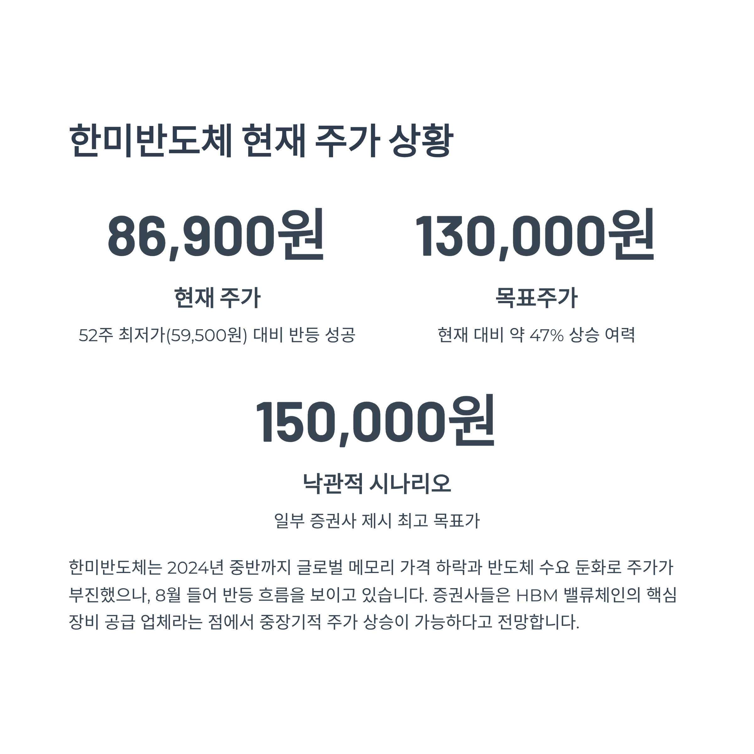 2024년 하반기 기준, 한미반도체 주가는 86,900원으로 52주 최저가(59,500원) 대비 반등에 성공했지만, 여전히 애널리스트들이 제시한 목표주가인 130,000원에는 40% 이상의 상승 여력이 남아 있습니다. 일부 증권사는 낙관적 시나리오로 150,000원까지의 상승 가능성도 제시하고 있어, 투자자들의 이목이 집중되고 있습니다.