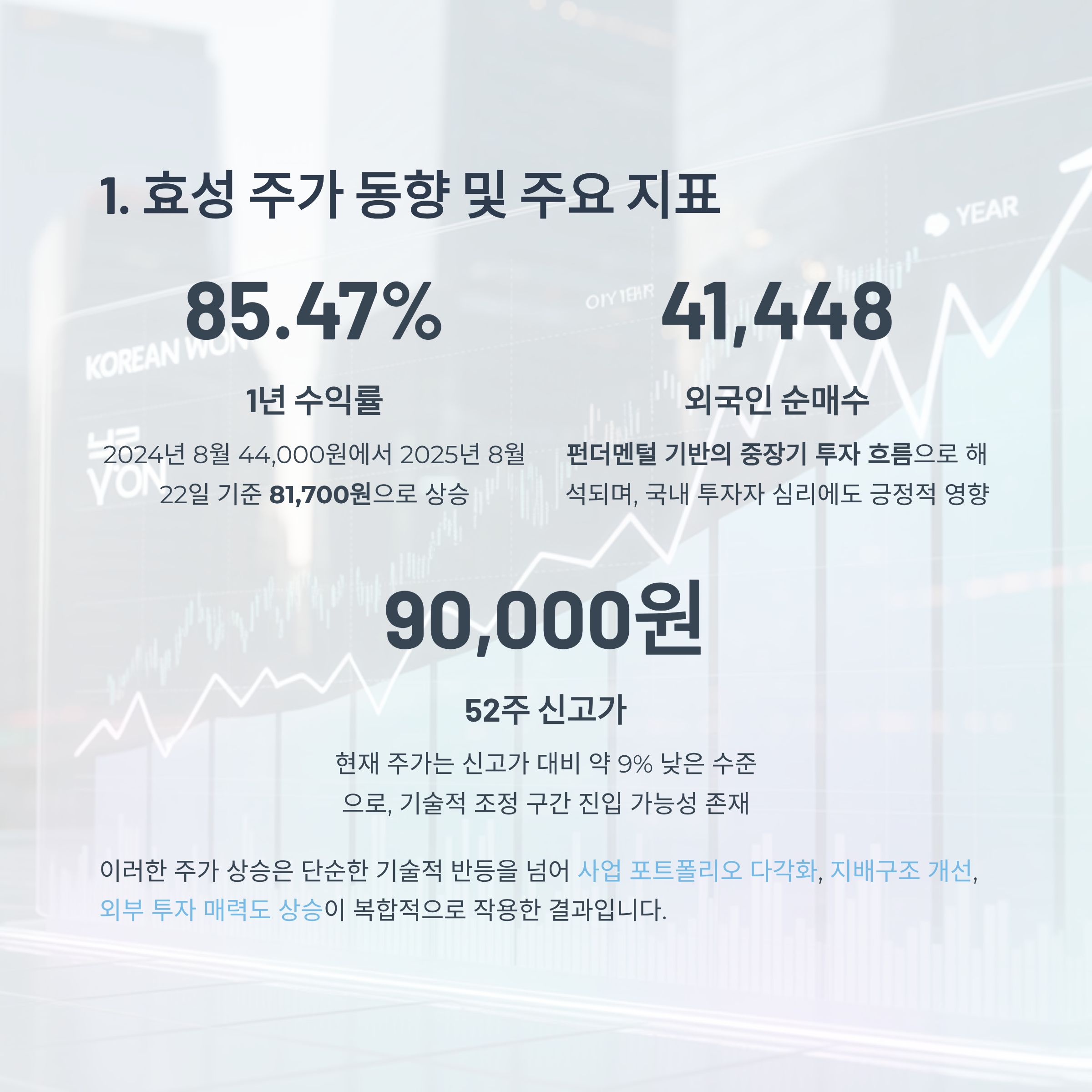 이는 단순한 기술적 반등을 넘어서, 회사의 사업 포트폴리오 다각화, 지배구조 개선, 외부 투자 매력도 상승이 복합적으로 작용한 결과입니다.