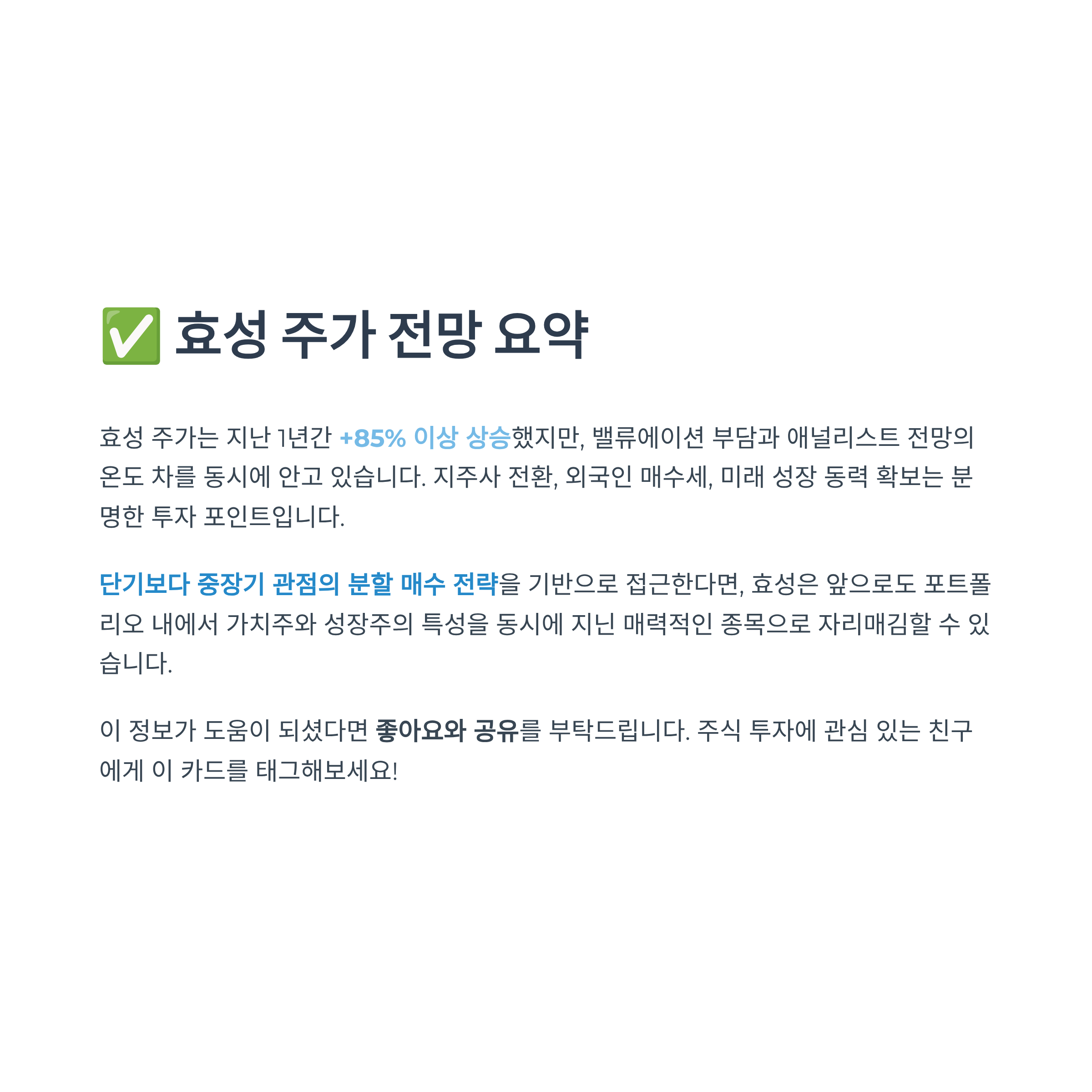 단기보다 중장기 관점의 분할 매수 전략을 기반으로 접근한다면, 효성은 앞으로도 포트폴리오 내에서 가치주와 성장주의 특성을 동시에 지닌 매력적인 종목으로 자리매김할 수 있습니다.