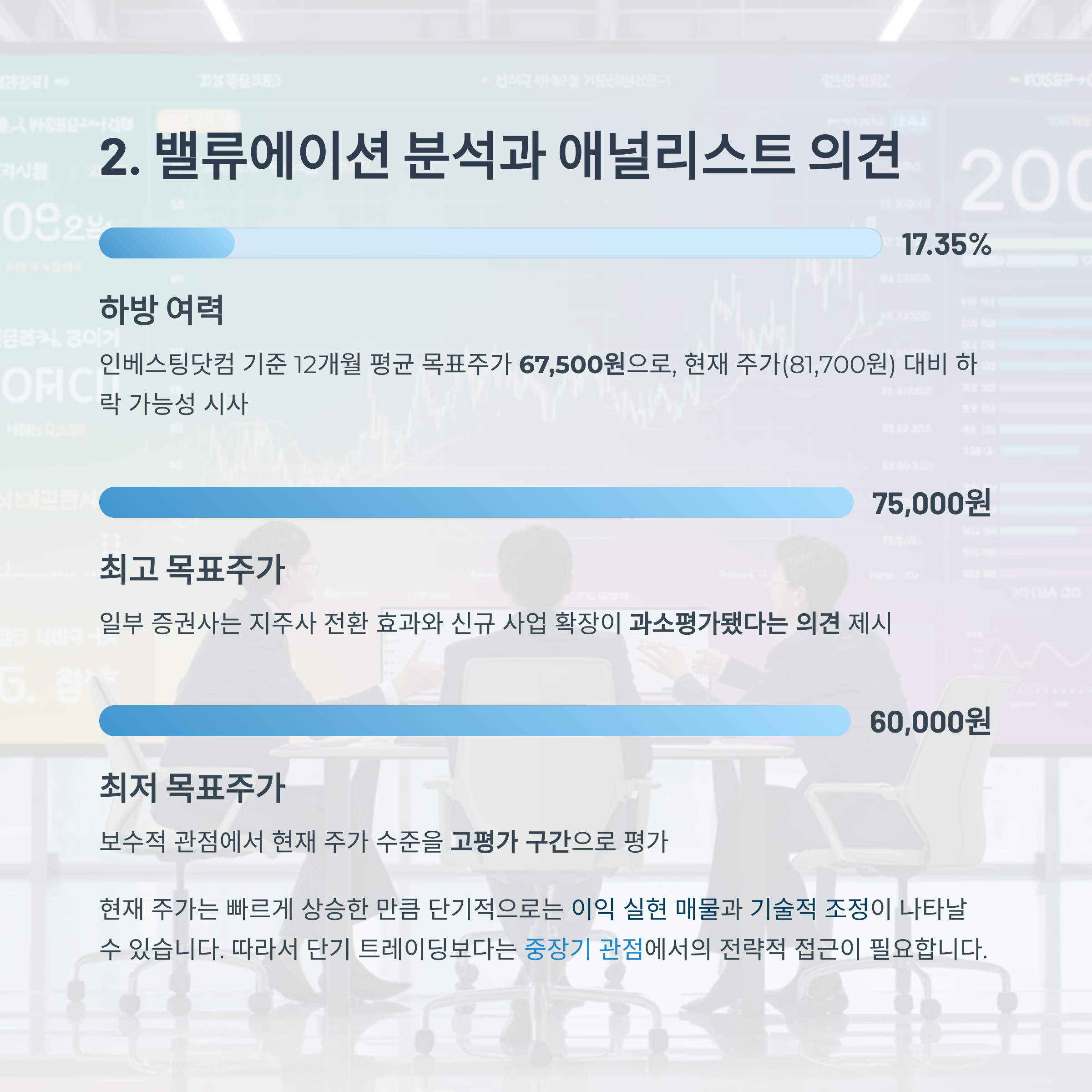 하지만 시장은 항상 양면성을 지닙니다. 현재 주가는 높은 수익률을 기록했지만, 밸류에이션 부담과 애널리스트 목표주가 하향 등도 동시에 존재합니다.
