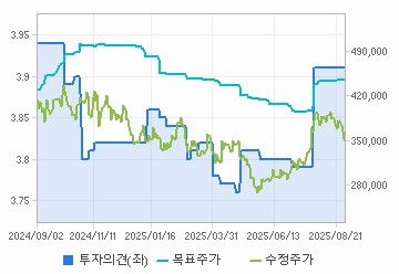 최근 집계된 주요 기관들의 목표주가 평균은 약 440,000원. 이는 현재 주가(363,500원) 대비 약 20% 이상 상승 여력을 의미합니다.