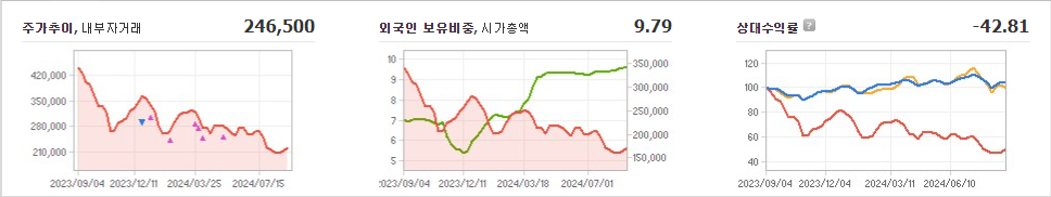 포스코퓨처엠의 현재 주가는 246,500원입니다. 전일 대비 -1.60원 이동한 모습입니다. 시가 총액은 18조6686억 원이며 발행 주식은 총 77,463,220주 입니다. 외국인이 보유한 비중은 9.79%입니다. 포스코퓨처엠 기업의 영업이익은 억 원을 달성했으며 배당 수익율은 0.07% 입니다.